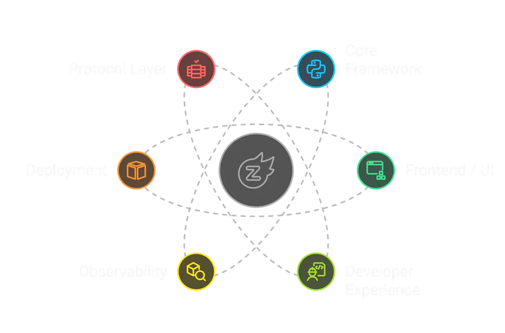 Zaltech provides a unified, standards-aligned developer surface that eliminates fragmented provider SDKs, custom MCP servers per project, and one-off UI bridges. It features a feature-based architecture where every capability is a vertical slice (tool + logic + UI), with built-in authentication, observability, and one-command deployment.